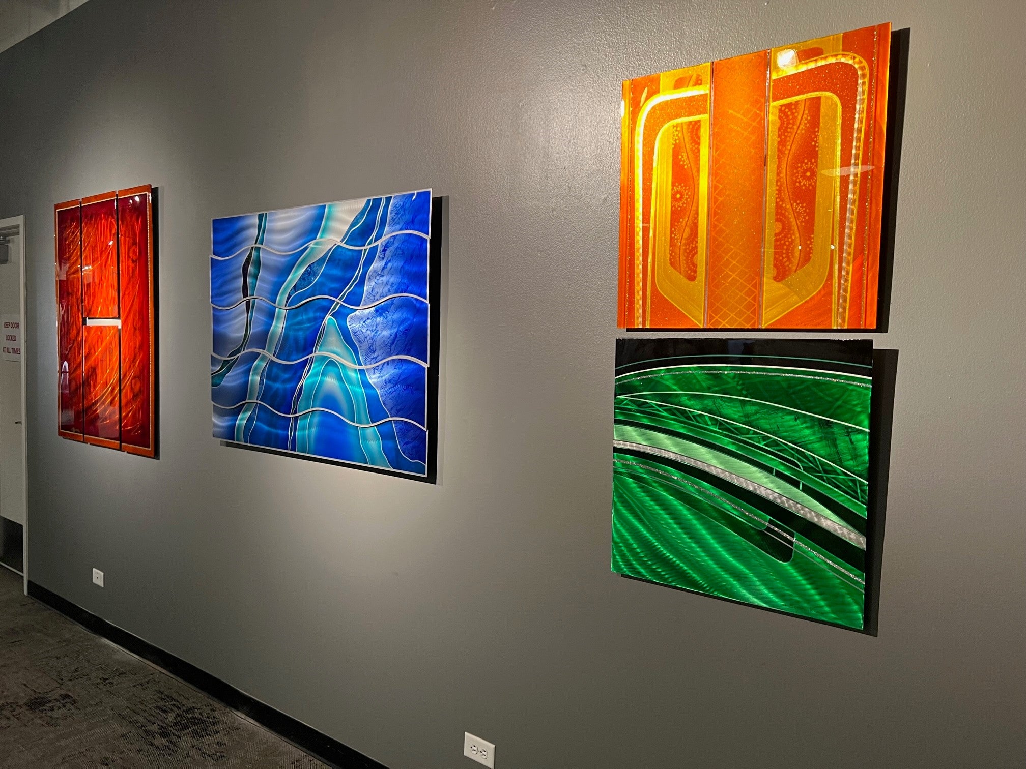 Esta serie de obras de metal que se exhiben en el edificio del Centro Cívico McNichols son ricas en color y tienen brillo. Los visitantes apreciarán esta técnica automotriz en una nueva forma.